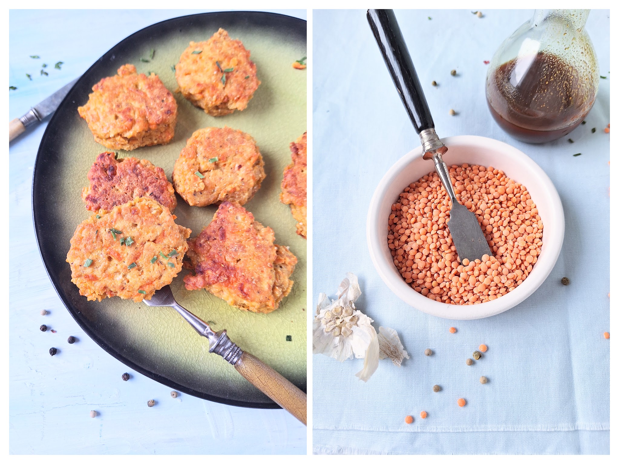 Runde Linsen-Karottenpuffer auf einem grünem Teller mit schwarzem Rand und rohe rote Linsen.