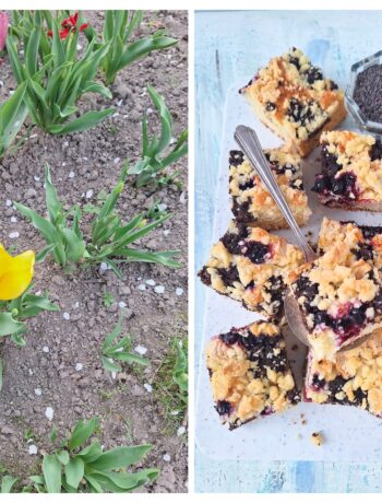 Tulpen und eckige Stücke von Streuselmohnkuchen.