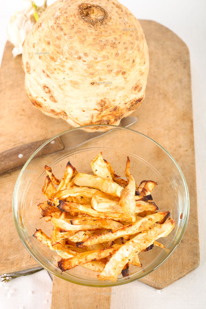 1. Die Sellerie- Knolle schälen, in Scheiben schneiden und dann dicke Stifte rausschneiden, sollen wie Kartoffel- Pommes aussehen.