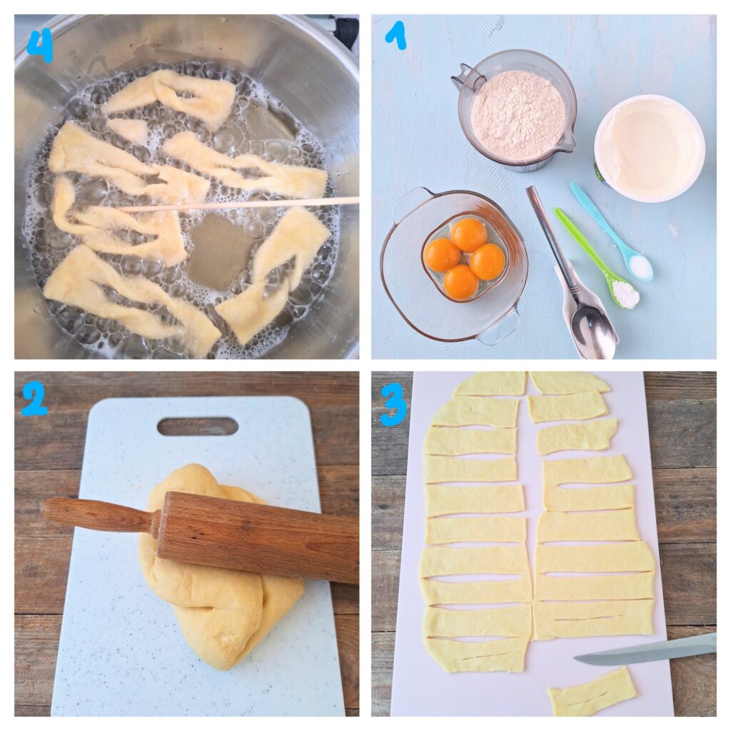 Besonders gelungen sind diese Teigschleifen, wenn sie viele Luftblasen haben. Dafür muß man sich intensiv mit dem Teig beschäftigen. Ausrollen, wieder zusammen falten. Und zwischendurch kräftig mit dem Nudelholz drauf hauen. Und das Ganze etwa mindestens 10- 15 Minuten wiederholen. Manche Hausfrauen bearbeiten den Teig…eine Stunde. Sie schwören darauf, dass die Faworki dann unvergleichlich zart gelingen. Andere sparen die Zeit und drehen den Teig durch den Fleischwolf. Ich wähle die Option mit dem Nudelholz. Ein Paar ordentlich drauf hauen, schon ist man frau richtig entspannt.