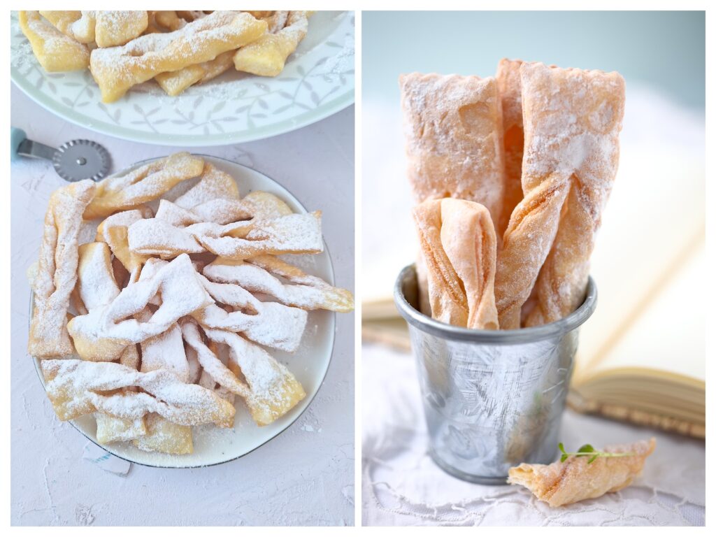 Der andere Name Faworki kommt aus dem Französischen. Das Wort „ faveur” bedeutet „Gunst“ oder „Gefallen“ und bezog sich ursprünglich auf Schleifen, die Ritterinnen ihren Liebsten schenkten. Moment…wat? Ritterinnen? Gab es weibliche Ritter im Mittelalter? Wo habe ich das denn her?Bestimmt eine mentale Abkürzung. Hmmm. wahrscheinlich geht es um die Damen, die Ihren Rittern den Schleifen gaben. Als Glücksbringer in den Kampf. Oder aus Verbundenheit und Verehrung. Also Liebesschlaufen.