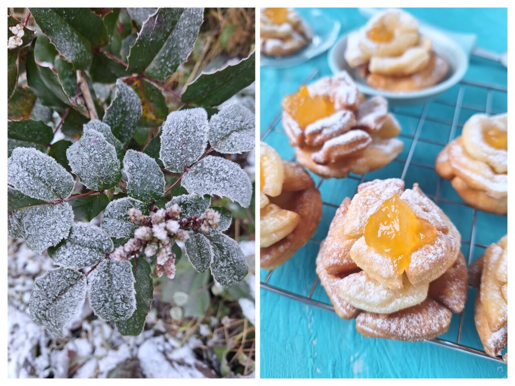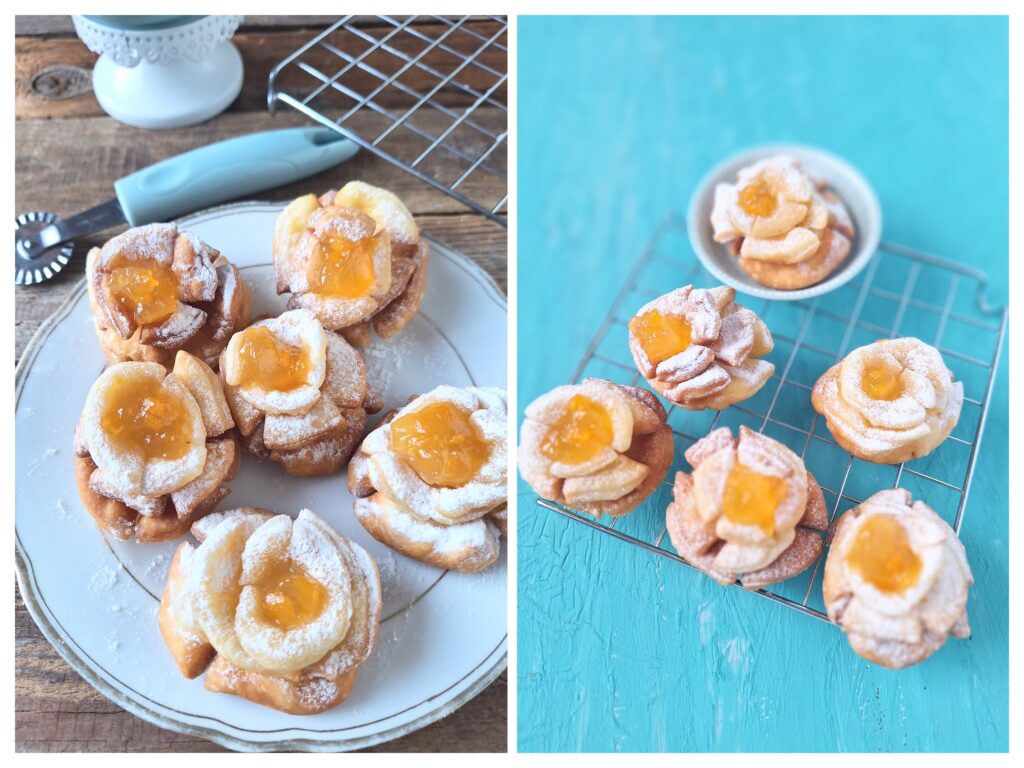 Diese wunderschönen Karnevalsrosen kenne ich schon seit meiner Kindheit. Es gibt verschiedene Anleitungen für dieses Gebäck. Bei mir zu Hause haben wir immer 3 unterschiedlich großen Kreise aufeinander gestapelt. Und vorher jeden Kreis 4 Mal eingeschnitten. Nach dem Backen hat man die Rosen mit roter Marmelade gefüllt. Natürlich hatte ich heute keine zur Hand. So gibt es ausnahmsweise eine Pfirsich- Füllung. Was eigentlich ein No- Go ist. Schrecklich 😉