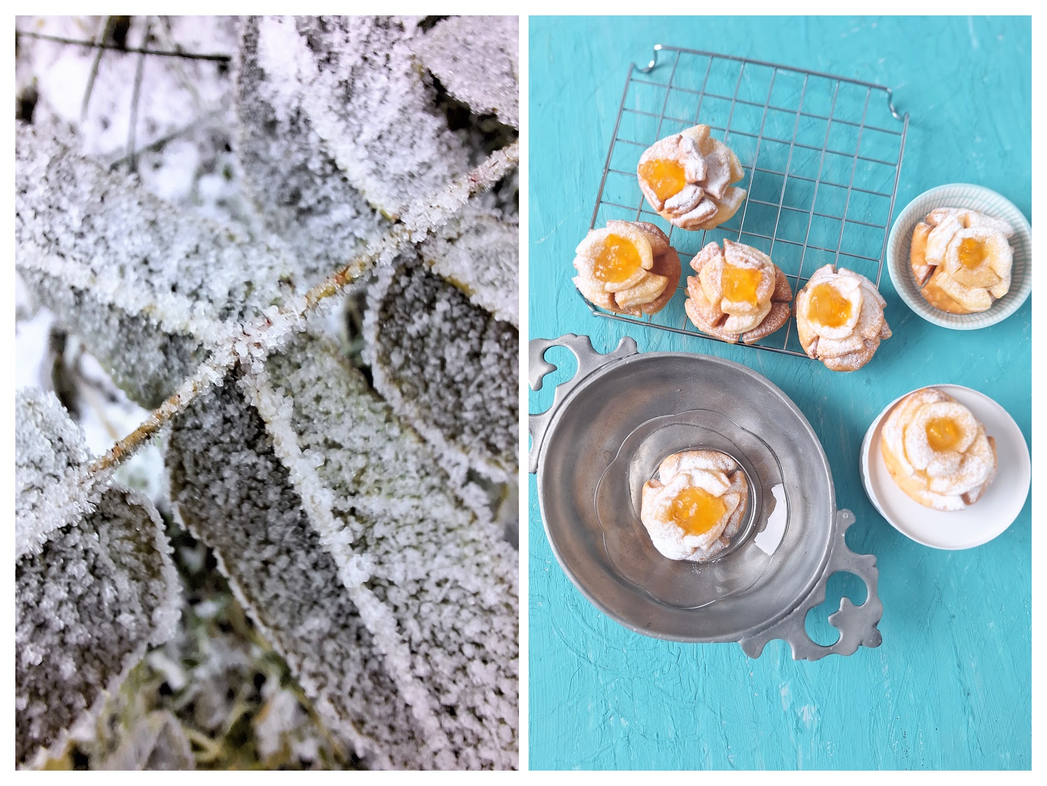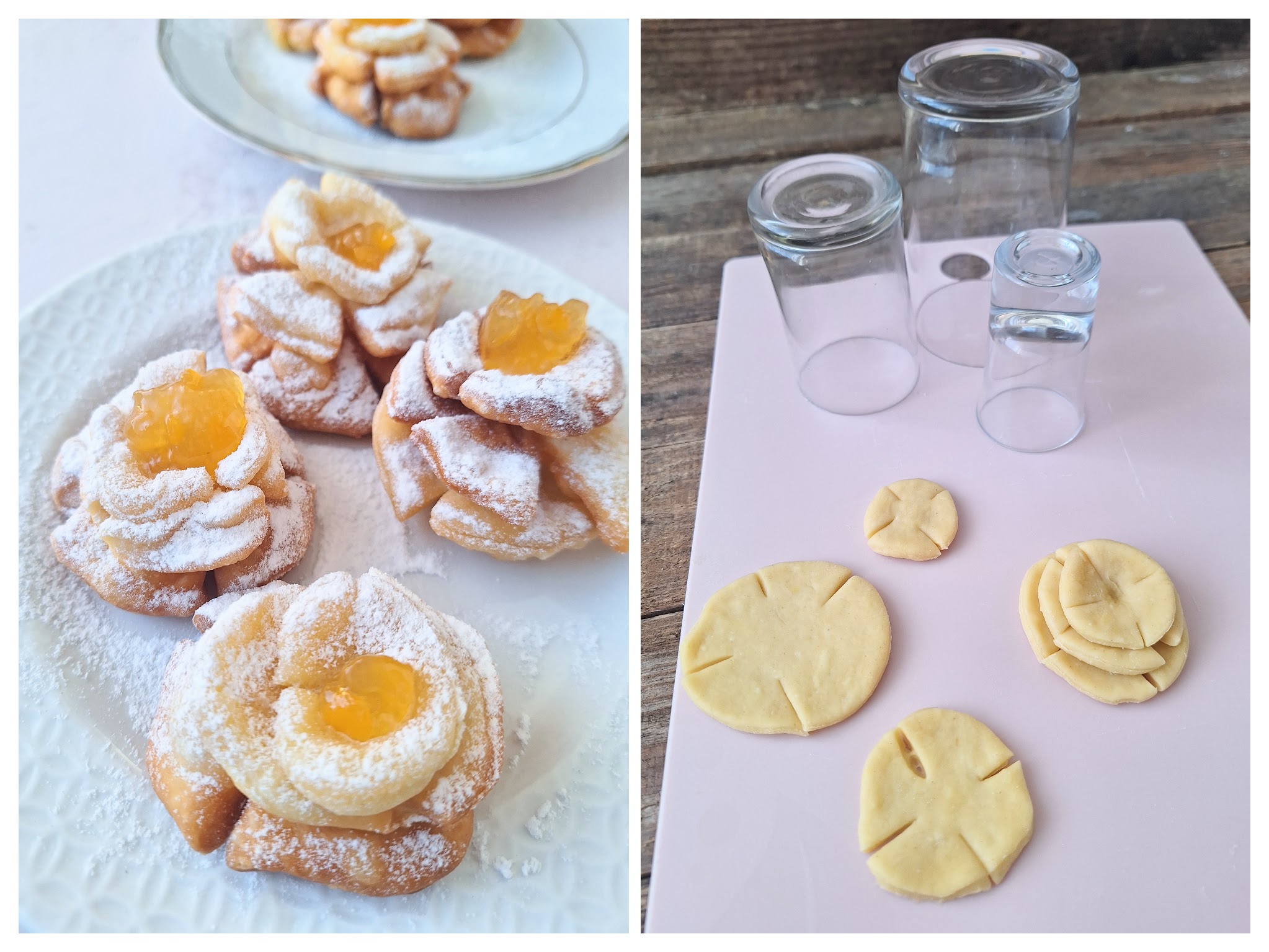 Diese wunderschönen Karnevalsrosen kenne ich schon seit meiner Kindheit. Es gibt verschiedene Anleitungen für dieses Gebäck. Bei mir zu Hause haben wir immer 3 unterschiedlich großen Kreise aufeinander gestapelt. Und vorher jeden Kreis 4 Mal eingeschnitten. Nach dem Backen hat man die Rosen mit roter Marmelade gefüllt. Natürlich hatte ich heute keine zur Hand. So gibt es ausnahmsweise eine Pfirsich- Füllung. Was eigentlich ein No- Go ist. Schrecklich 😉