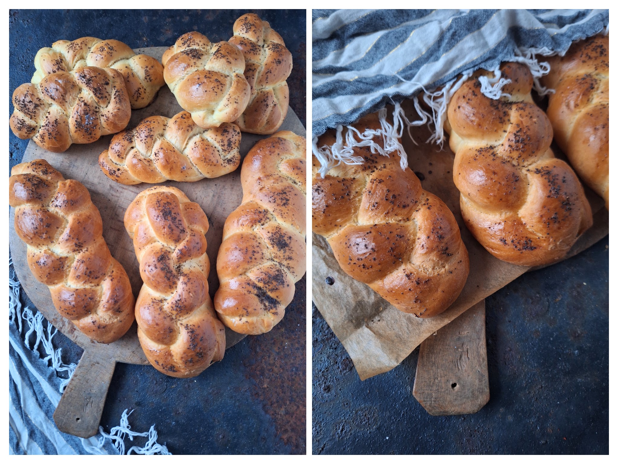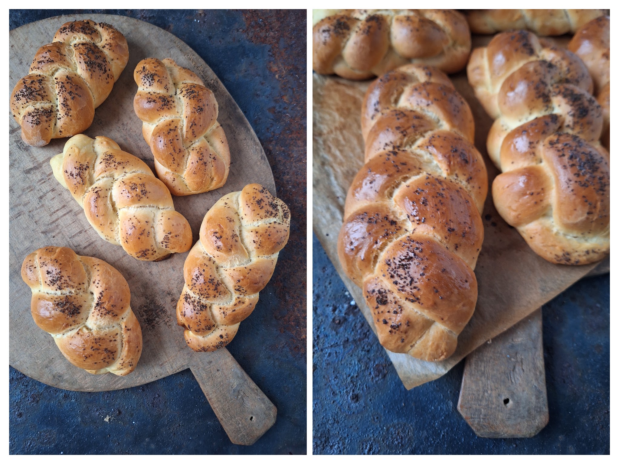 Alle Chałki mit einem Tuch abdecken und nochmals 30 Minuten gehen lassen. Den Backofen auf 180 Grad Ober- und Unterhitze vorheizen. Das Eigelb mit der Milch verquirlen, die Zöpfe damit bestreichen und mit Mohn bestreuen. Bei 180 Grad ca. 15 bis 20 Minuten goldbraun backen.