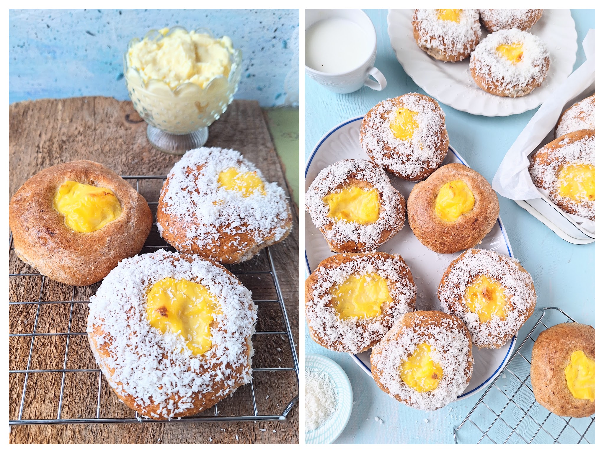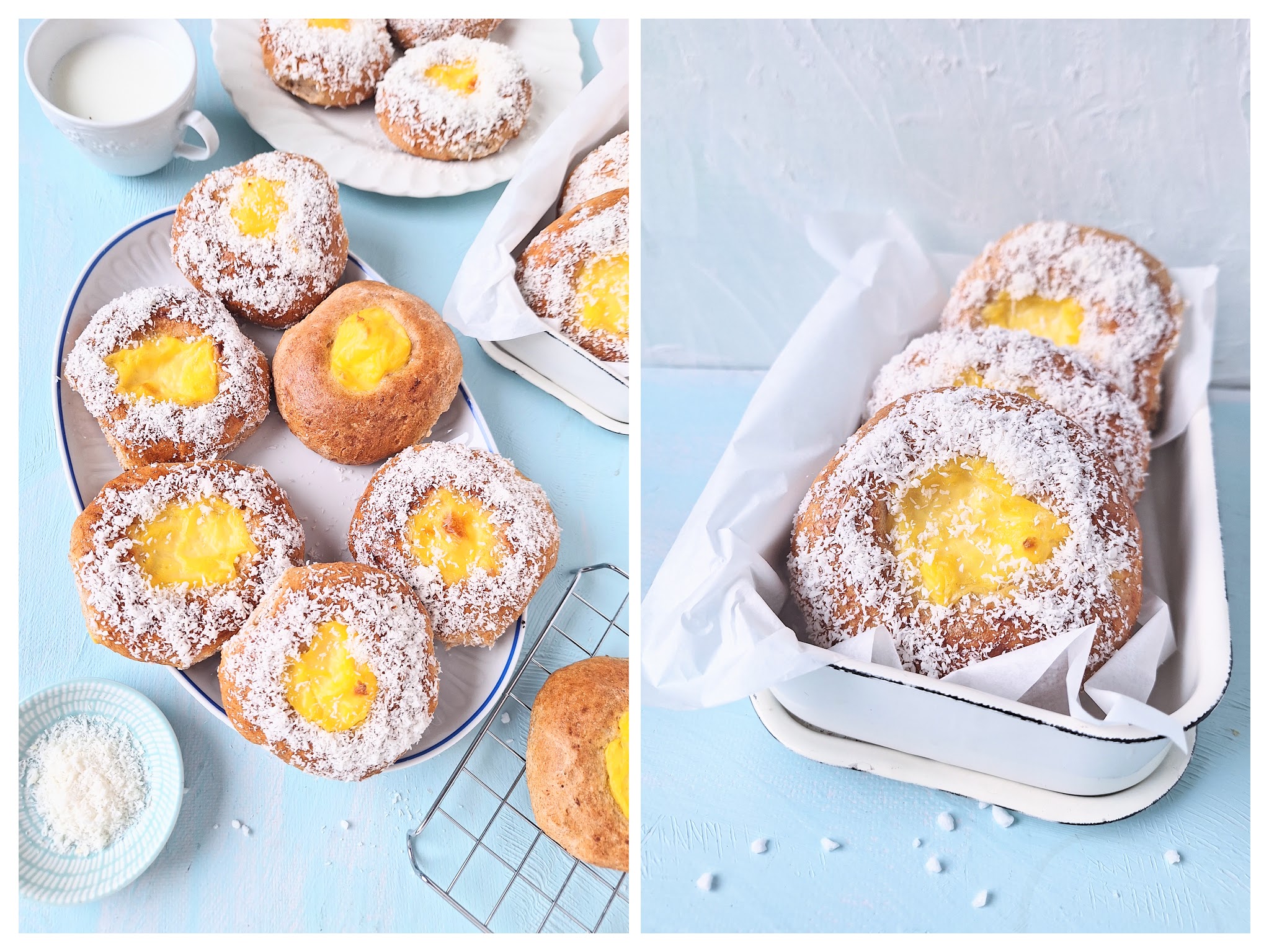 Norwegen? „Ich war noch niemals in New York, ich war noch niemals auf… auf?“ In Norwegen! … La la la lala lala la. Du auch nicht? Macht nichts! Diese köstlichen Hefebrötchen bringen dir das skandinavische Lebensgefühl direkt in die Küche. Eingehüllt in weiße Kokosraspeln wie in frisch gefallenen Schnee, blinzeln sie dich mit ihrem gelben Vanille-Auge an und flüstern verführerisch: „Iss mich!“